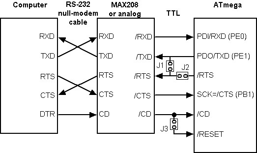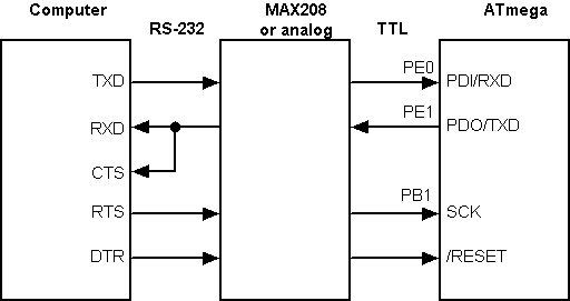 Если разрабатываемое на базе ATmega устройство имеет порт RS-232, то этот порт можно использовать также и для загрузки прошивки микроконтроллера, и для отладки с помощью GDB.