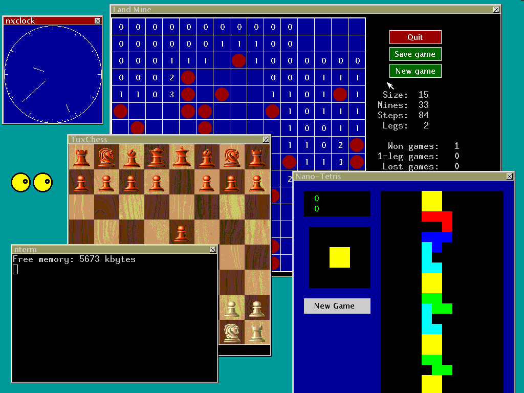 uOS на процессоре i386 с оконным интерфейсом Nano-X. Показан набор примеров из дистрибутива Nano-X.